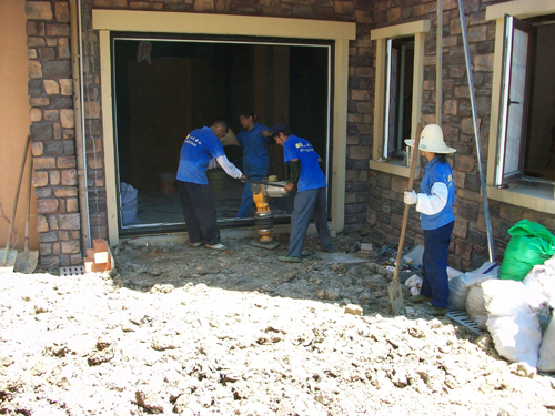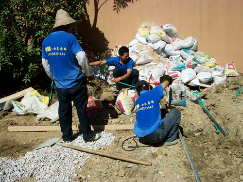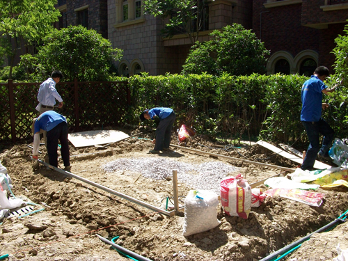 目前龍湖滟瀾山水電工程已結(jié)束,正在為防腐木休閑平臺打基礎。