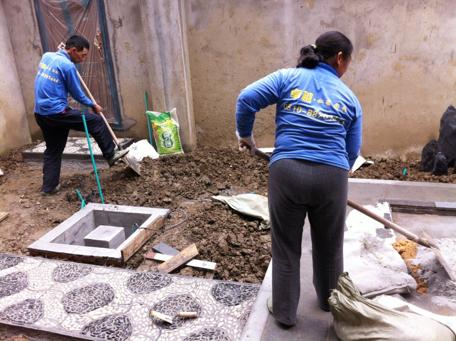 工人們正在整理場地,準備鋪設汀步,做竹滴水